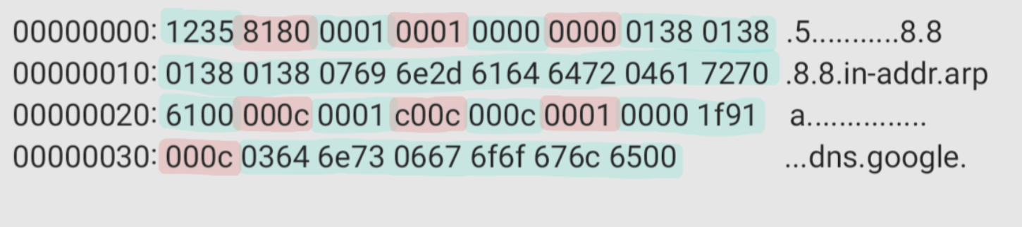 echo "12 35 01 00 00 01 00 00 00 00 00 00 01 38 01 38 01 38 01 38 07 69 6e 2d 61 64 64 72 04 61 72 70 61 00 00 0c 00 01" | xxd -r -p | socat - UDP:8.8.8.8:53 | xxd