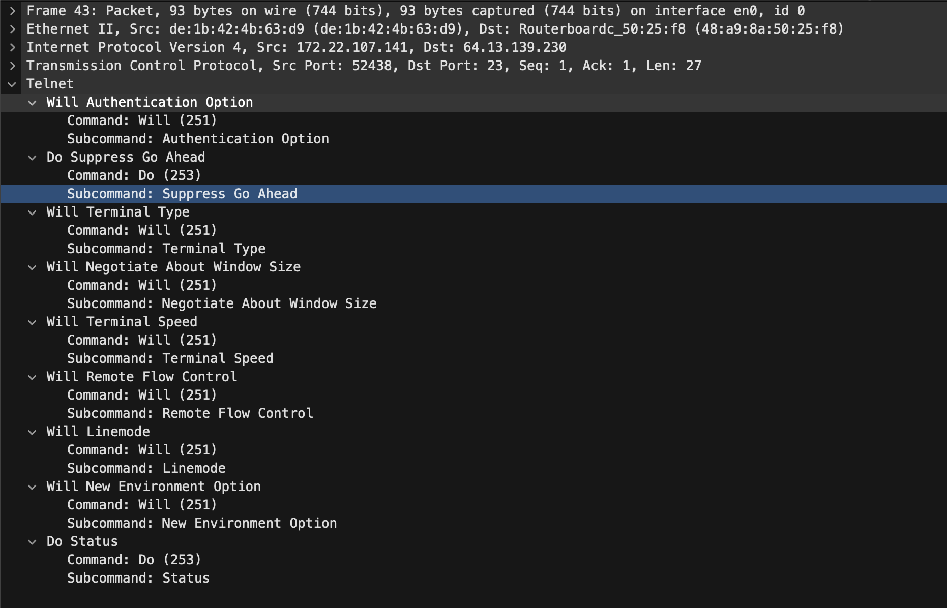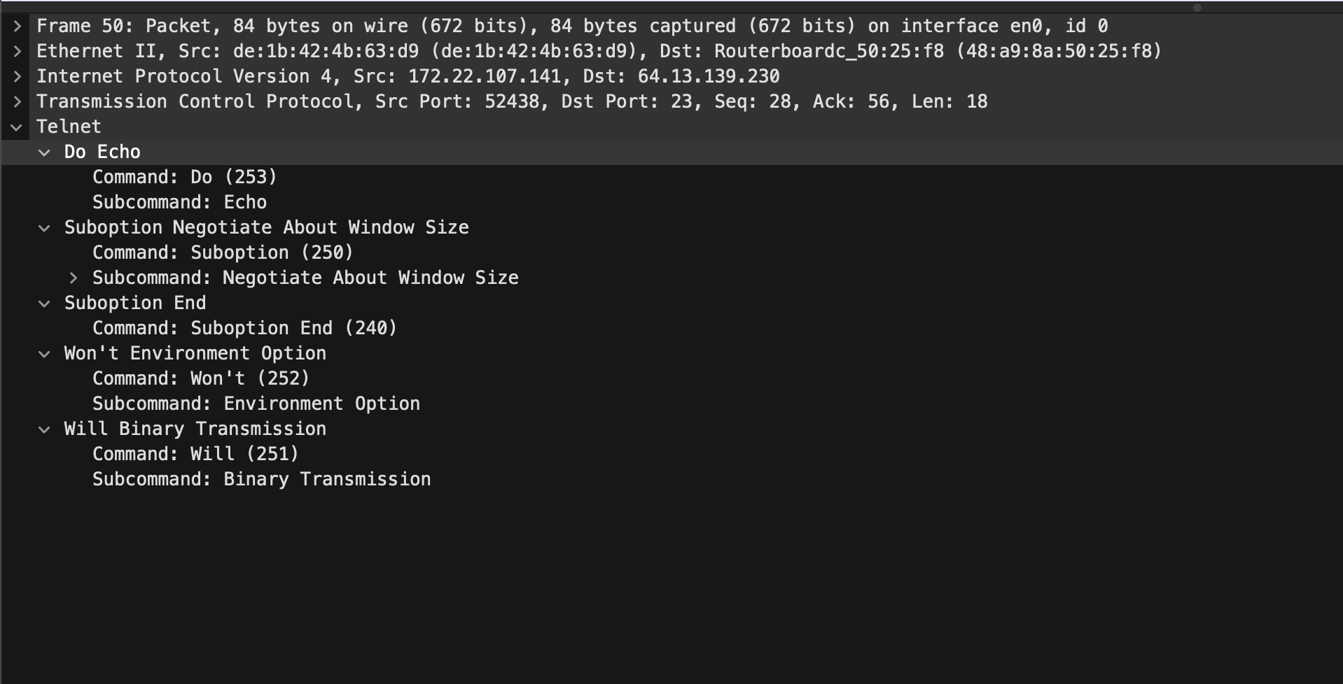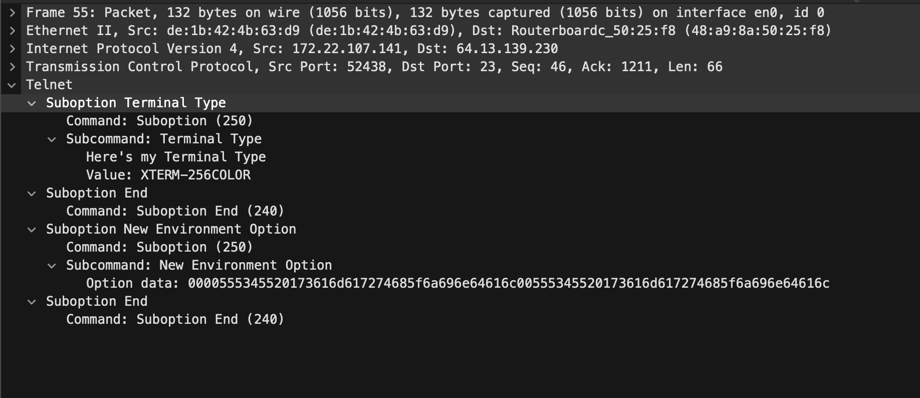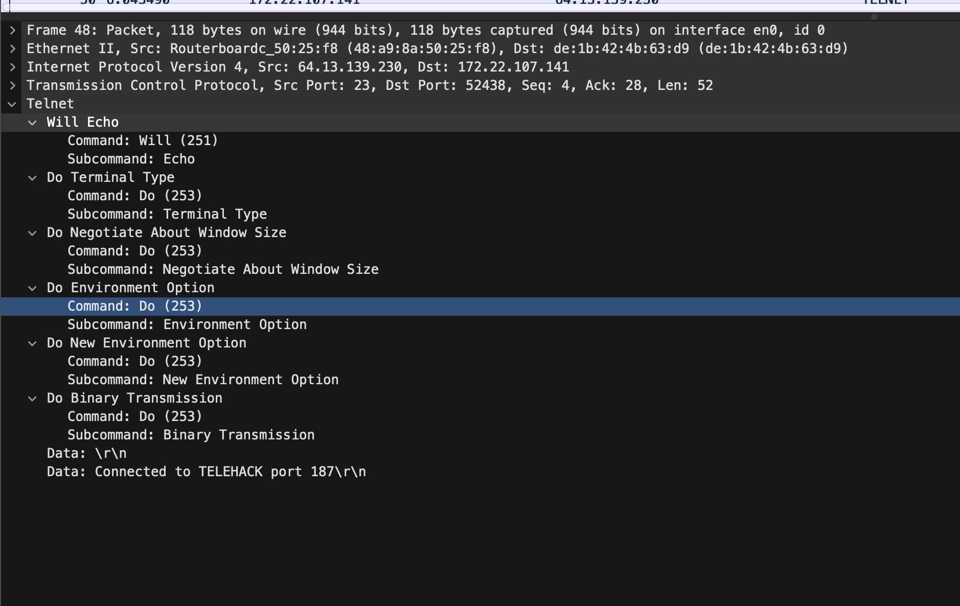 | ENVIRONMENT/NEW-ENV | 43(WILL) → 48(DO) → 50(WONT), 52→55(Subnegotiation) |