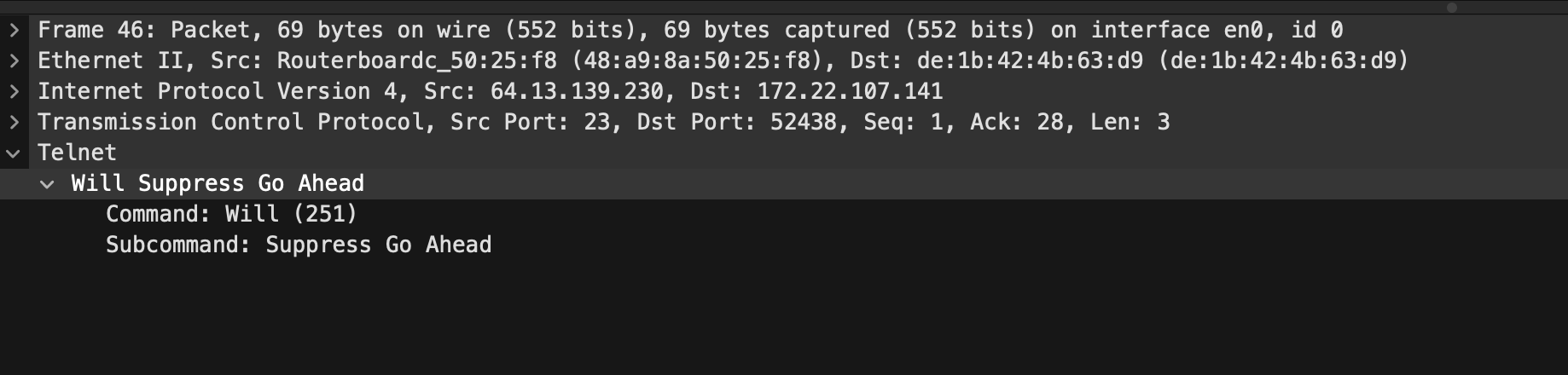 0xff0xfd0x030xff(255) isIAC,0xfd(253) forDo, 0x03 (3) forSuppress Go Ahead