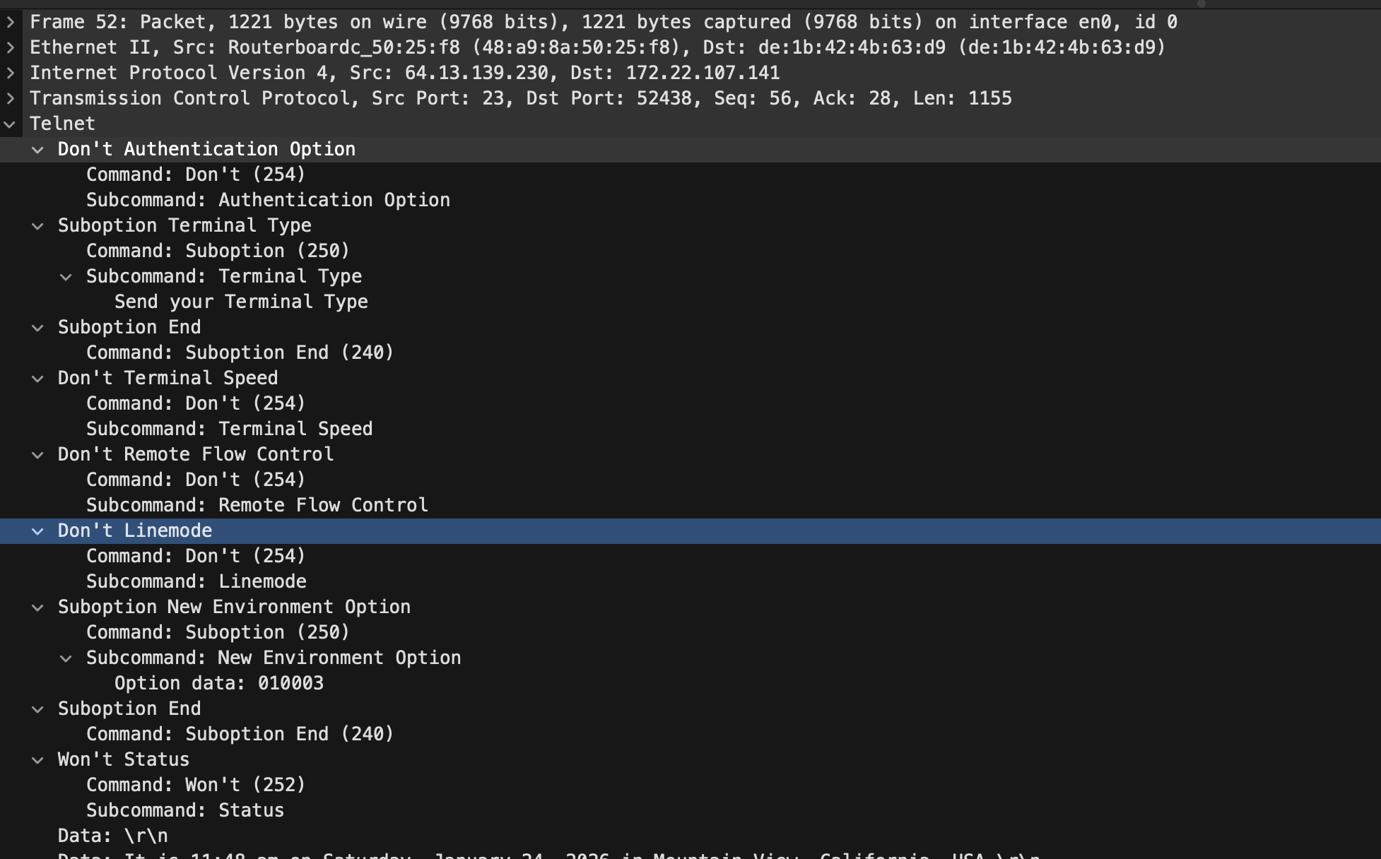 | LINEMODE | 43(WILL) → 52(DONT) |