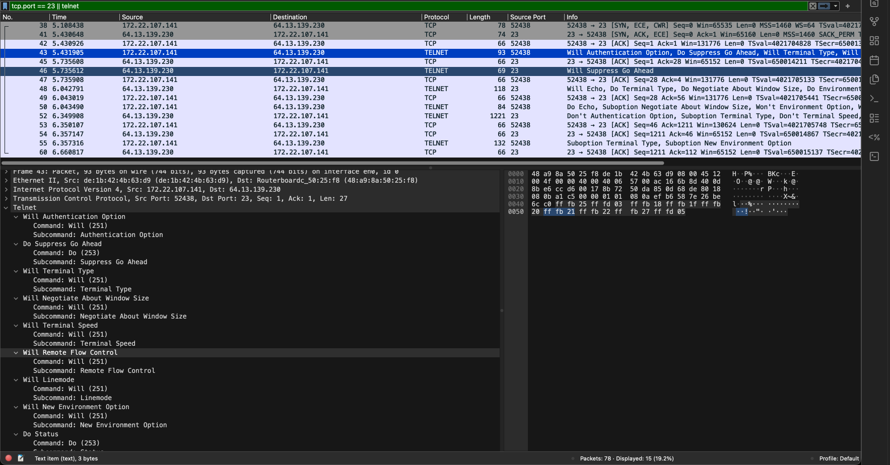 Start capture using Wireshark with filter tcp.port == 23 . Then connect: